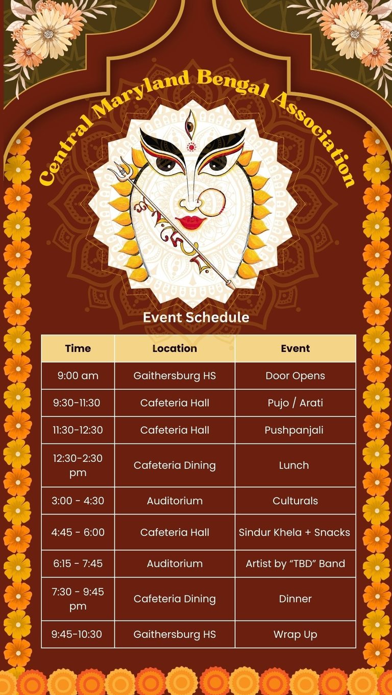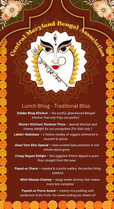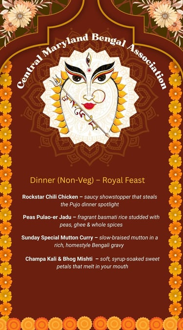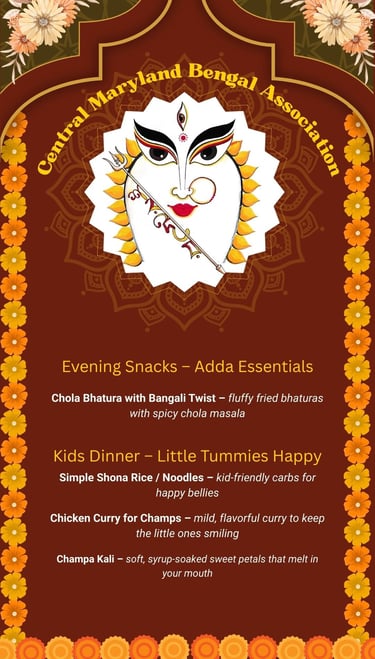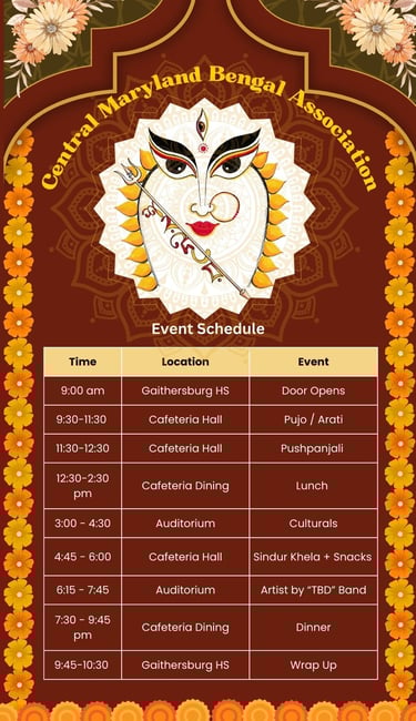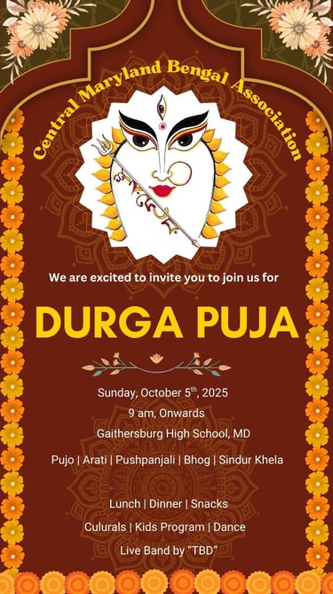 Carrying this spirit forward, CMBA (Central Maryland Bengal Association) proudly presents Parbon’s Sharodutsab this year. On October 5th, 2025 (9 AM onwards), Gaithersburg High School - 101 Education Blvd, Gaithersburg, MD 20877 will come alive with joy, laughter, and heartfelt connections.